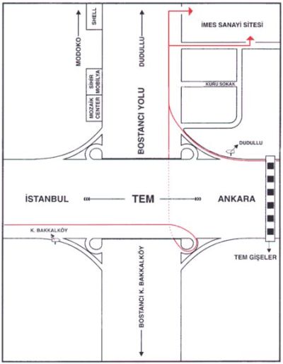 TEM gişelerden çıkar çıkmaz ilk sağdan çıkıp 250 mt ilerleyip İMES Sanayi Sitesine ulaşın.
